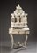 Importante stipo architettonico lastronato in avorio decorato con applicazioni in argento smaltato e quarzo avventurina, intervallate da miniature su avorio, sormontato da gruppo scultoreo a tutto tondo raffigurante Venere e Apollo su triclivio poggiante su un basamento di forma poligonale. Cappello svasato decorato con quarzo avventurina e applicazioni traforate in argento e smalti, di forma ovale raffiguranti putti e profili. Fascia di raccordo sfaccettata con cassetto frontale decorata da 10 miniature rettangolari di dimensioni diverse a raffaellesche centrate da medaglioni figurati in cornici d'argento, fregi smaltati. Cornicione aggettante con dieci sfingi in avorio a tutto tondo in sequenza montate su placche in quarzo avventurina con cornici in argento. Fascia con cassetti in linea, decorati con miniature su avorio a raffaellesche, teste di cherubini, profili muliebri e figure mitologiche. Lesene a cartiglio in argento e smalti policromi con medaglioni in quarzo avventurina. Antine frontali celanti cassettiera; fascia decorata da 10 placchette dipinte raffiguranti scene mitologiche nella maggior parte titolate, in cornici d'argento e smalti intervallati da colonne in quarzo avventurina con capitelli e basi in avorio scolpito. Fascia inferiore con tre cassetti decorati da 10 miniature raffiguranti le stagioni, le fasi della giornata e i quattro elementi tra raffaellesche poggianti su pilastri squadrati recanti dodici miniature in avorio con l'iscrizione dei mesi dell'anno in cornici d'argento. Tavolo d'appoggio sagomato lastronato in avorio di forma ottagonale con cassetto e fasce decorate da dodici placche in avorio scolpito raffiguranti scene mitologiche titolate, contenute in cornici in argento. Montanti con fregi in argento e smalti, quattro gambe mosse decorate da applicazioni in argento e smalti policromi riunite da traverse mosse centrate da vaso in avorio a tutto tondo a due anse figurate e placche in quarzo avventurina. Scarpette cesellate. Austria, sec. XIX (cm 80x178x63) (piccole mancanze) Imposing Austrian architectural cabinet with ivory veneering