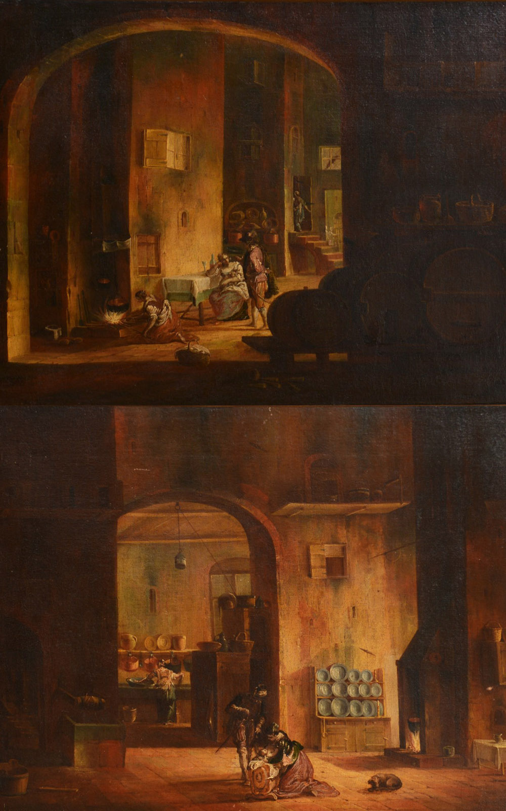 "Interni di cucina con figure" coppia di oli su tela (cm 53x67,5) In cornice dorata Gaudenzio Botti (Brescia 1698-1775) "Kitchen interior with figures" pair of oil paintings on canvas. Framed