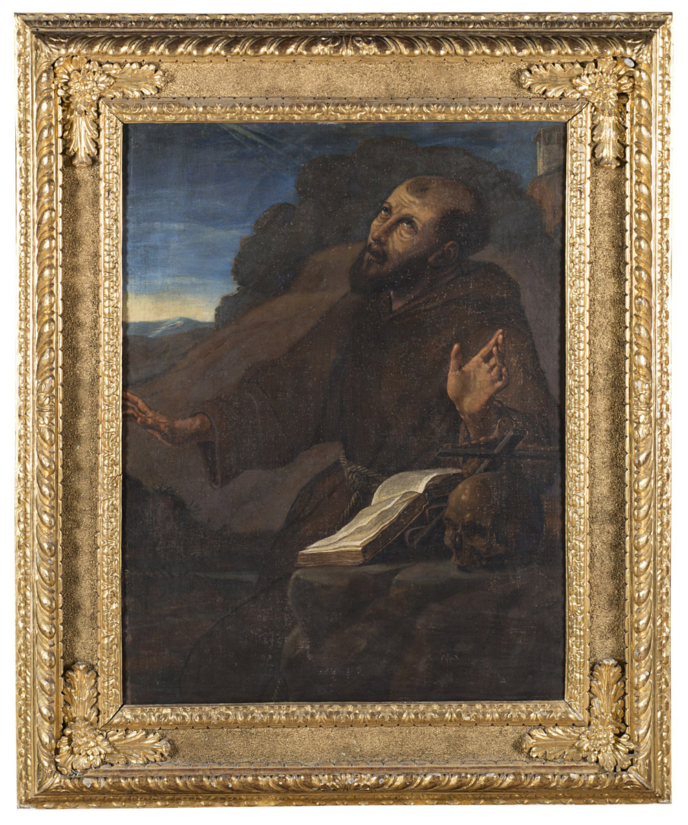 Maestro del secolo XVII "San Francesco" olio su tela (cm 119,5x92) In cornice dell'epoca con doratura di epoca posteriore, iscrizione al retro 17th-century master "St. Francis" oil on canvas. Framed