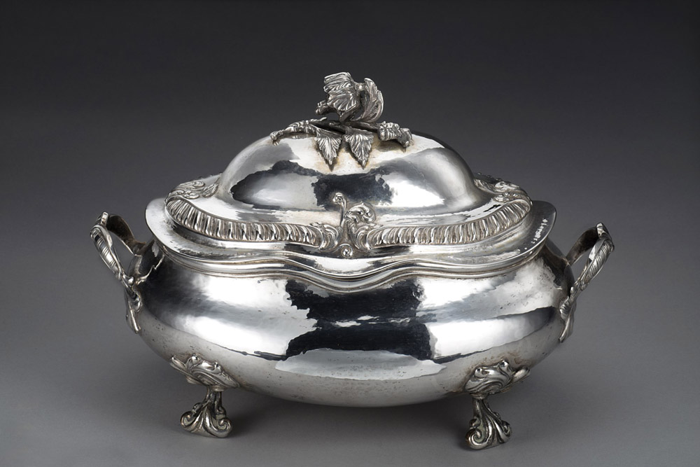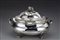 Grande zuppiera centrotavola biansata in argento. Corpo bombato liscio sorretto da quattro piedi. Coperchio a cupola decorato a volute fogliate e baccellature. Presa a fiore a tutto tondo. Manifattura Veneziana, sec. XIX/XX (gr 2880 ca) (cm 40x25x25) (lievi difetti) Large 19th/20th-century Venetian ornamental silver tureen (minor defects)