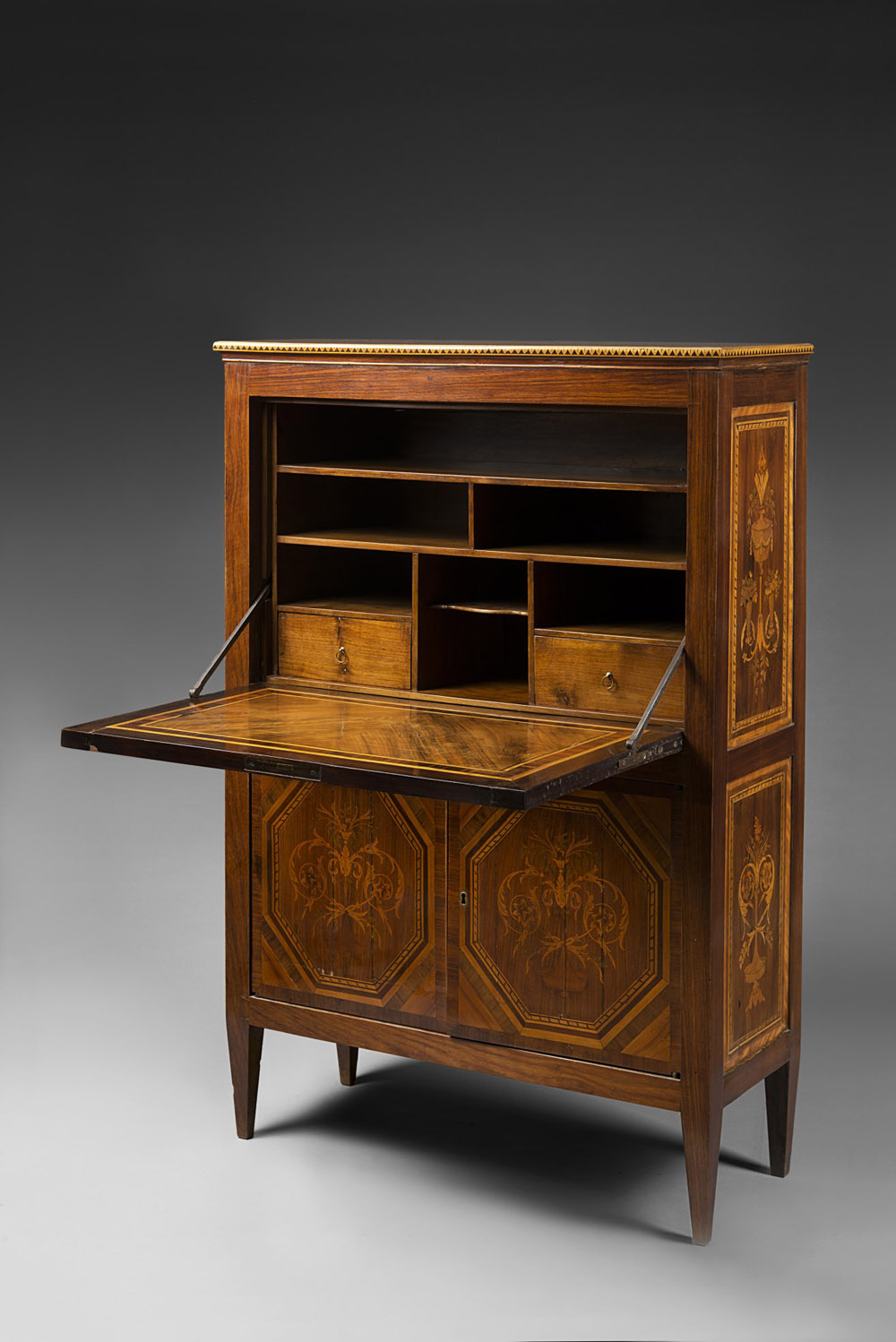 Secretaire in noce e radica con fronte ad un'anta ribaltabile celante vani e cassettini e due ante nella base. Intarsiato e filettato a volute fogliate e vasi fioriti. Fianchi decorati a motivi vegetali e fiori. Lombardia, sec. XVIII (cm 102x19x40) (difetti e restauri) 18th-century Lombard walnut secretaire (defects and restorations)