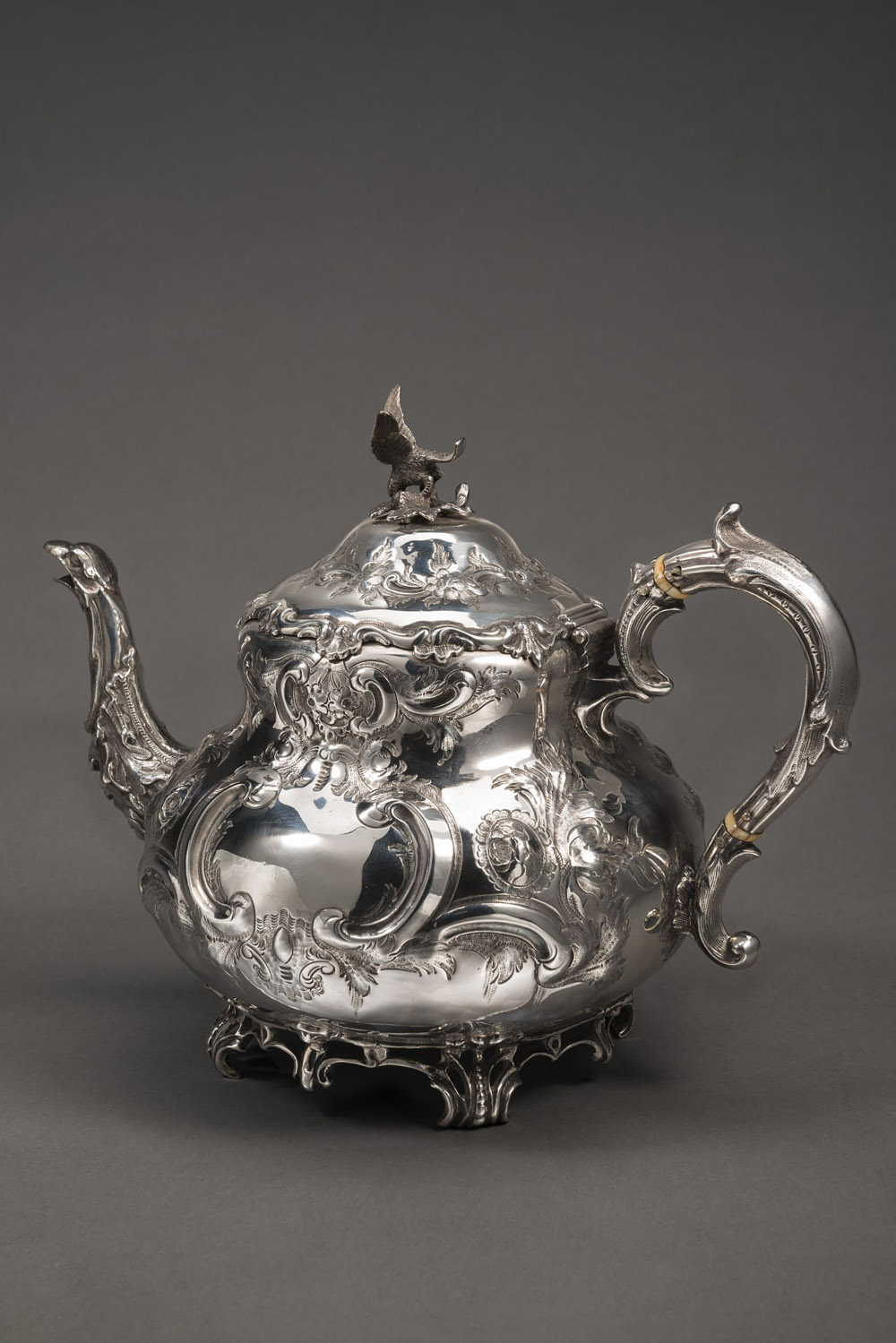 Teiera di forma bombata in argento sbalzato a foglie e fiori, iscritta in un cartiglio, presa del coperchio a volatile a tutto tondo, beccuccio zoomorfo con mascherone, ansa sagomata. Argentiere Richard Haedges, Città di Sheffield, 1852 (h. cm 20) (gr 780) (difetti) Rounded silver teapot. Sheffield, 1852 (defects)