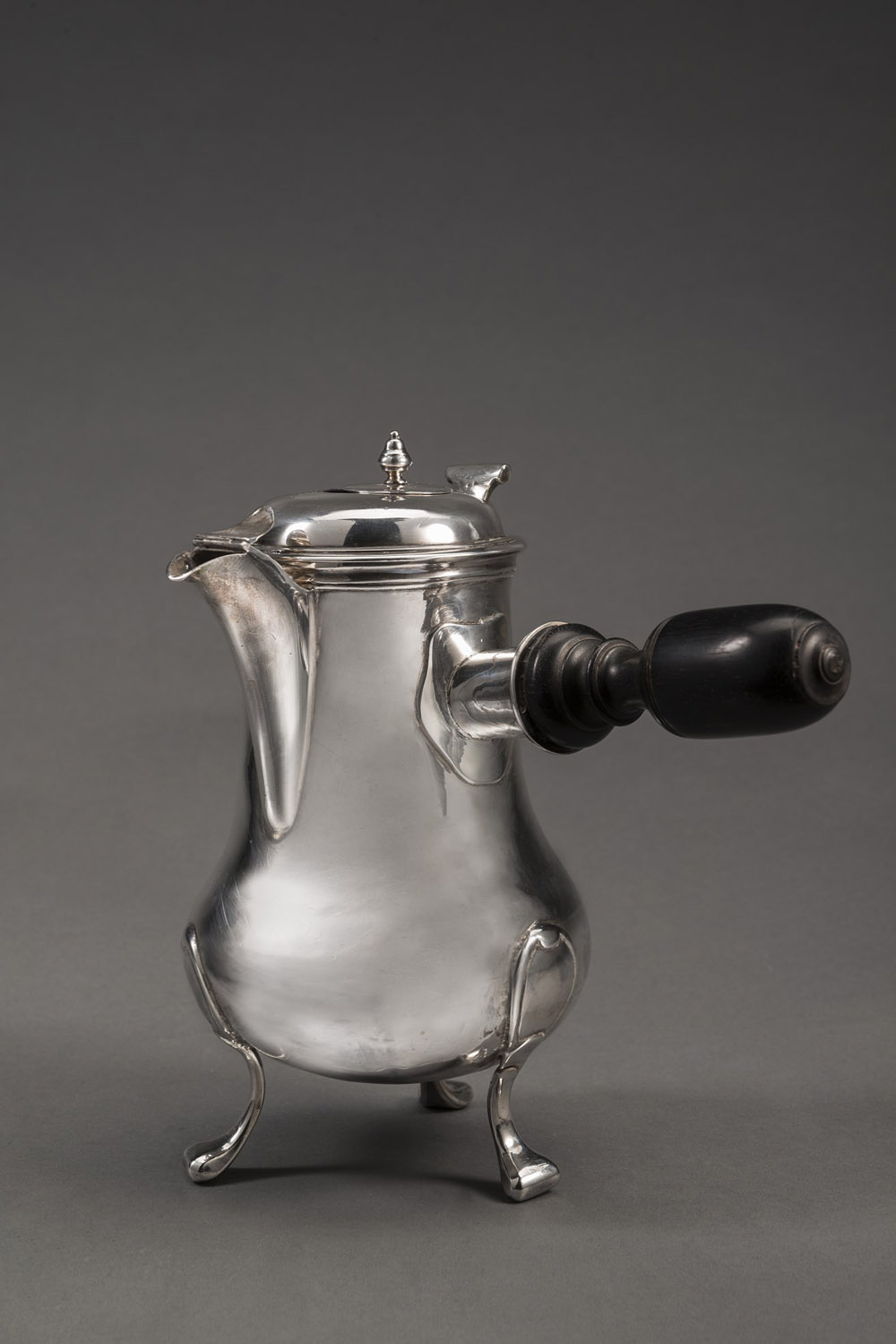 Cioccolatiera in argento a corpo liscio centrato da stemma nobiliare coronato inciso, poggiante su tre piedini sagomati, manico in legno tornito ed ebanizzato. Generalità di Parigi, 1775/1781 (h. cm 19) (gr lordi 470) (lievi difetti) Smooth silver chocolate box. Paris, 1775/1781 (minor defects)