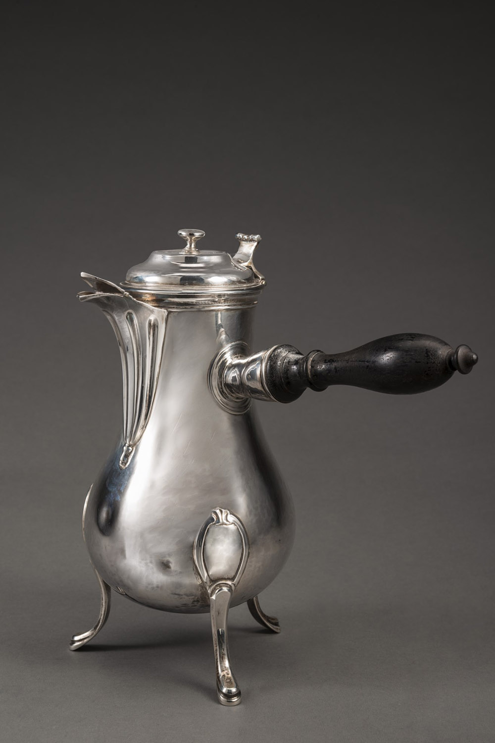 Cioccolatiera in argento a corpo liscio con presa in legno ebanizzato e piedini mossi, decorati all'attacco a volute. Parigi, 1782. Argentiere Jean Luois-Dieudonné (h. cm 22) (gr lordi 580 circa) (difetti) Smooth silver chocolate box. Paris, 1782 (defects)