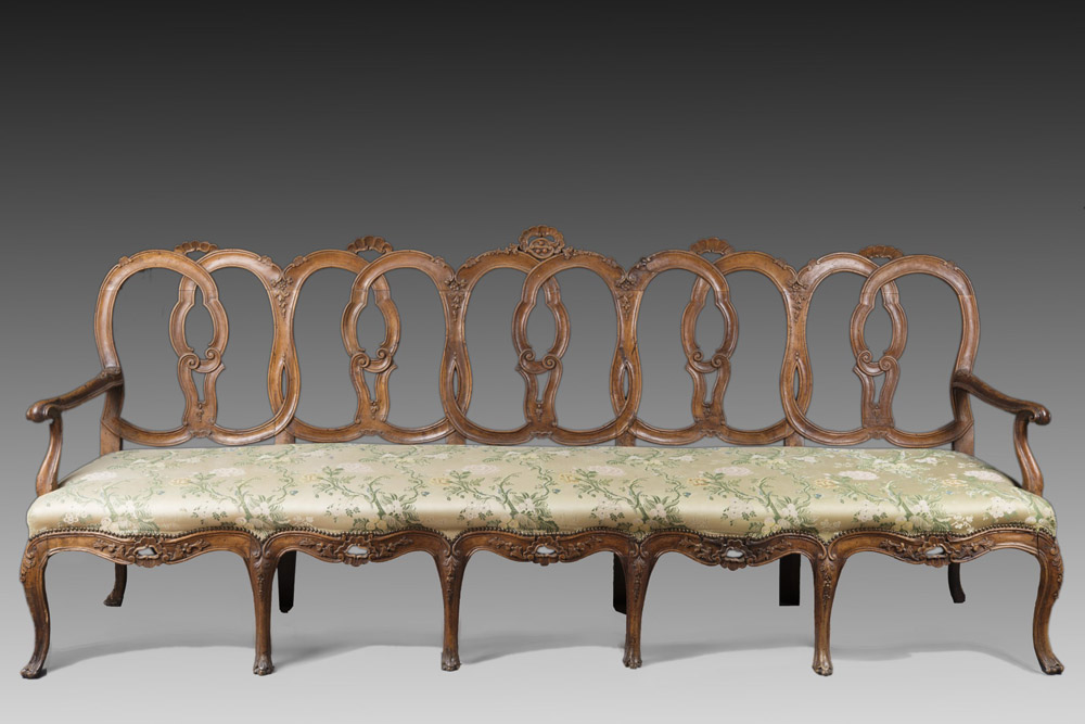Divano da portico in noce con schienale traforato e intagliato a conchiglie...