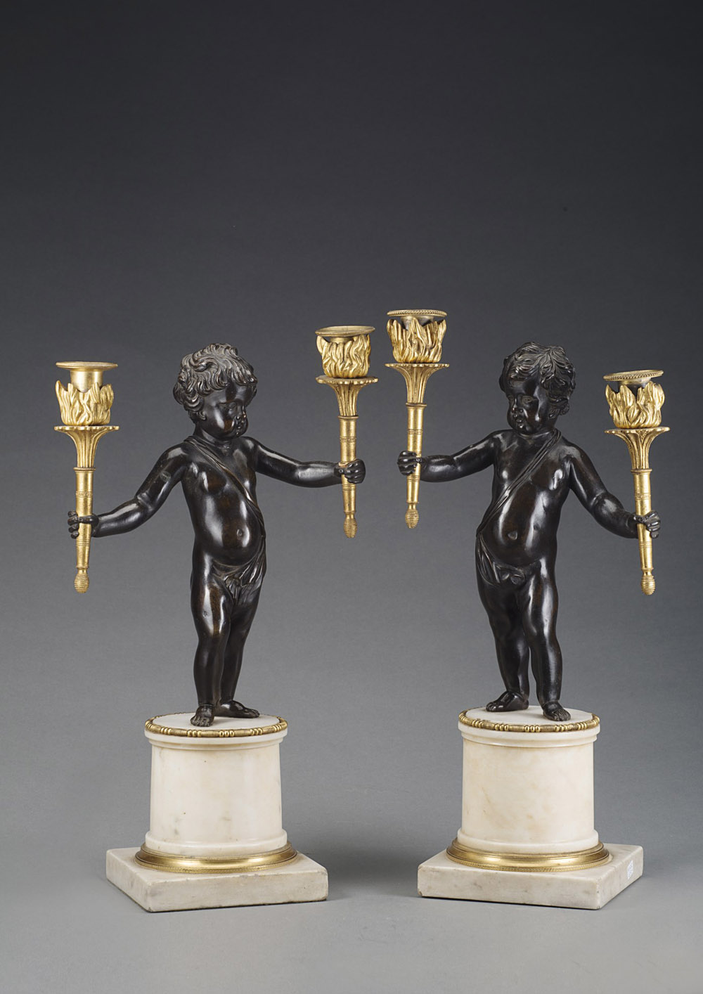 Coppia di candelieri a due fiamme, in bronzo raffiguranti putti che sorreggono porta candele in bronzo dorato. Basi in marmo bianco tornito con ghiere cesellate. Inizio sec. XIX (h. cm 40) Pair of early 19th-century candle holders