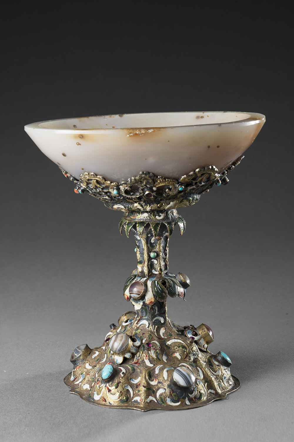 Antica alzata con base in metallo dorato e sbalzato, decorata a smalti a freddo, con pietre dure, agata di vario colore, coralli, turchese, paste vitree sui toni del rosso, vaschetta in quarzo microcristallino, dentritico (h. cm 13,5) (lievi difetti) Ancient epergne with gilt-metal base (minor defects)