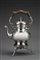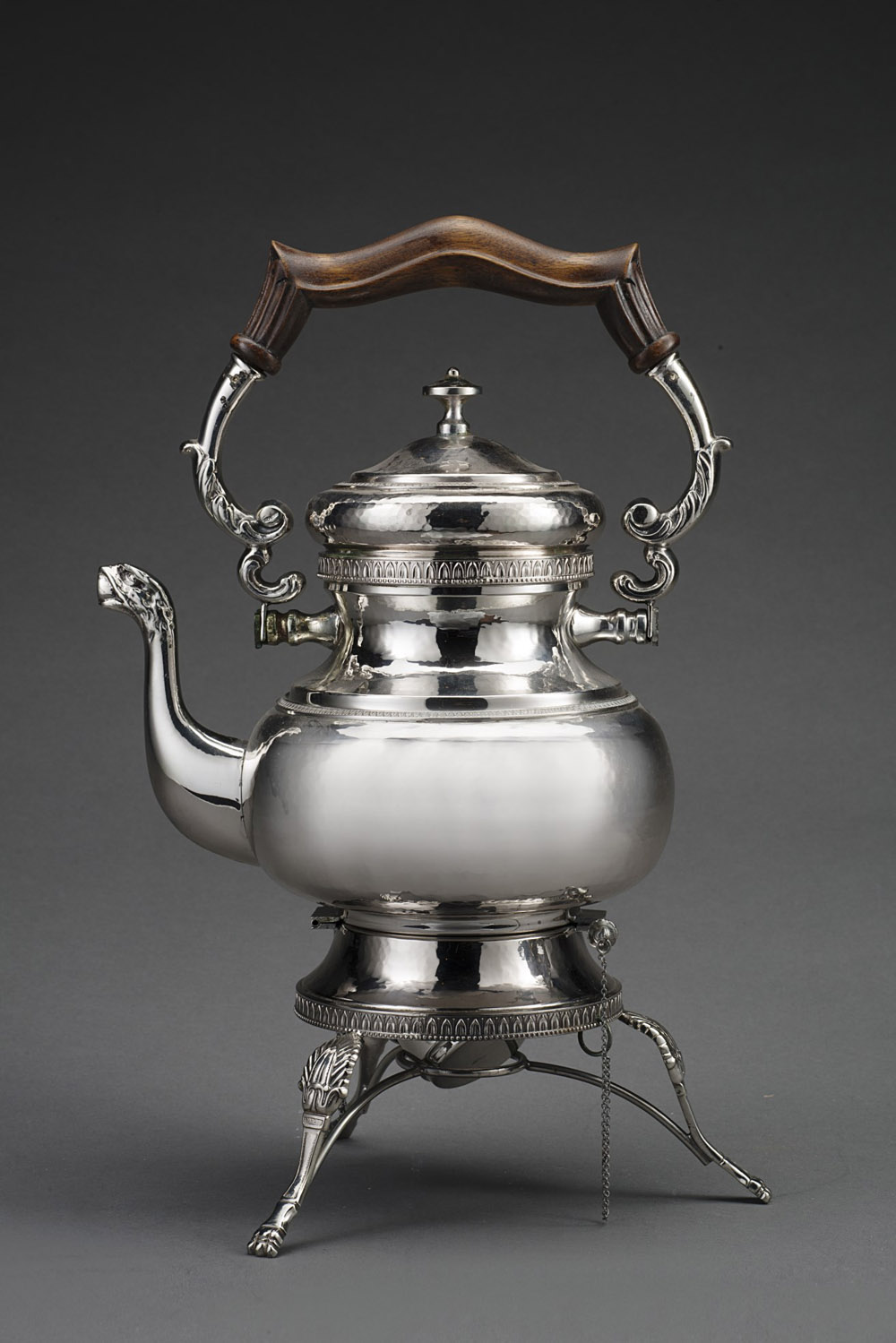 Teiera con fornelletto in argento a corpo liscio. Presa sagomata in legno,...
