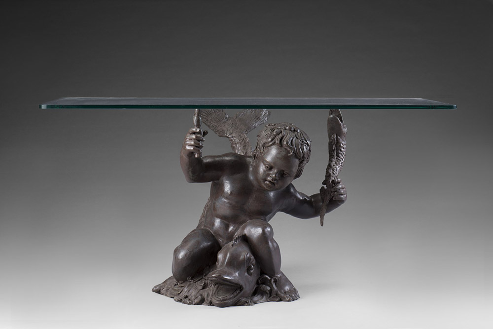 Base per tavolo da salotto con piede in bronzo raffigurante un putto a...