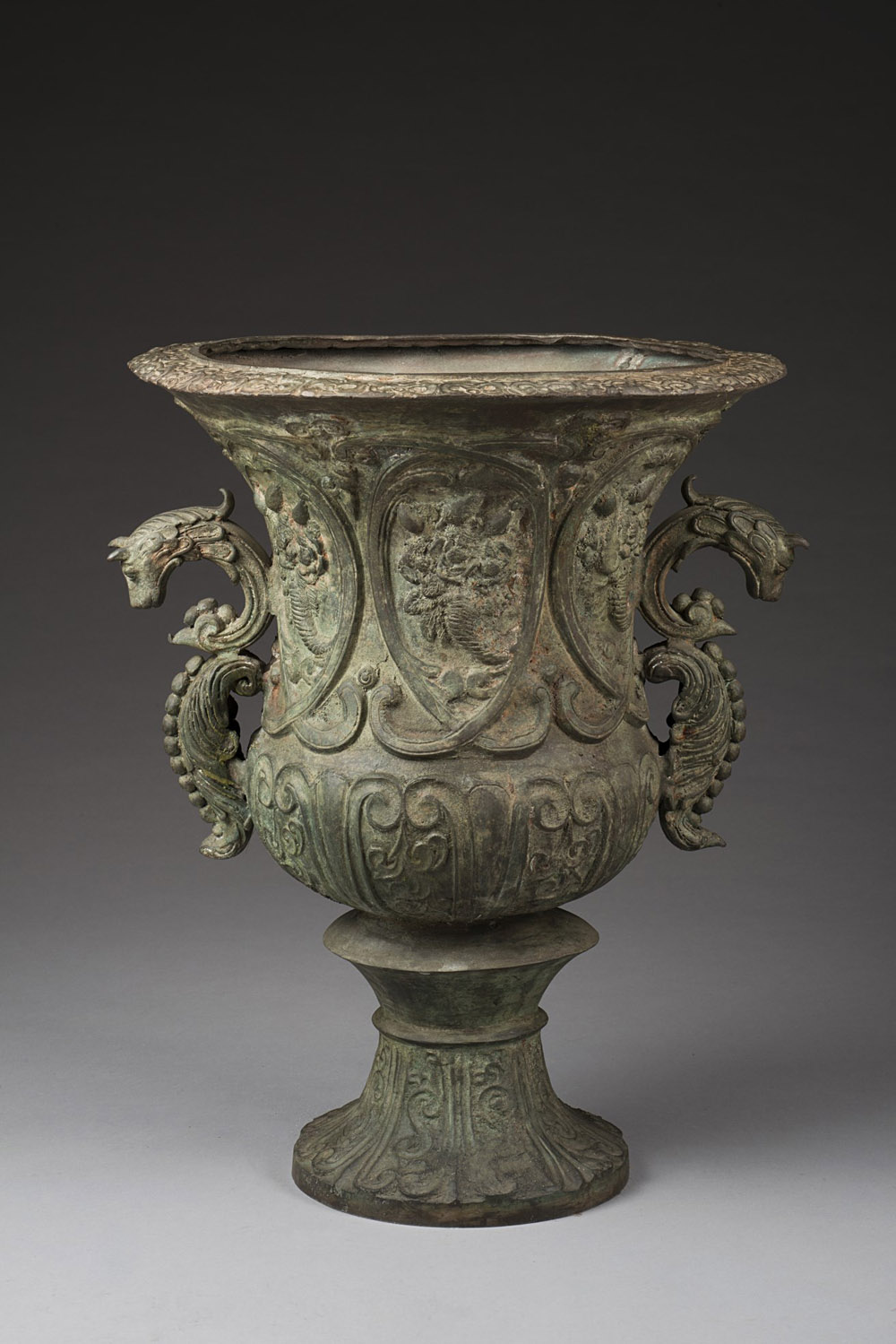 Vaso biansato in ferro decorato a motivi vegetali. Anse ad animali fantastici...