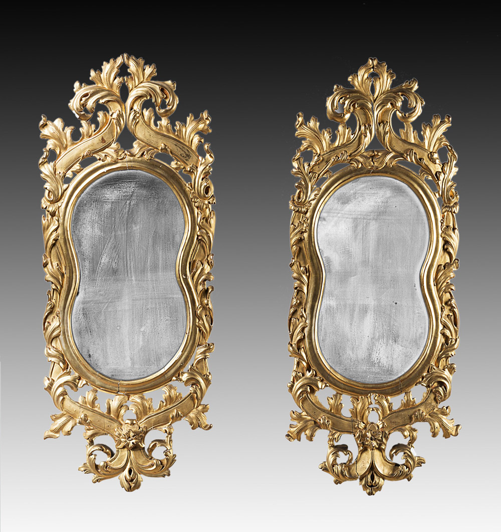 Coppia di ventole in legno intagliato e dorato a volute fogliate, sec. XIX (cm 100x47) (difetti) Pair of 19th-century carved gilt-wood mirrors (defects)
