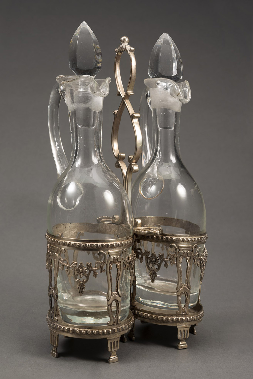 Servizio da tavola in argento con base decorata a festoni floreali, piedini scanalati. Argentiere CM, Forlì/Ravenna (h. cm 24) (gr 270) (bottiglie non coeve) (difetti) Silver tableware set (bottles of different periods) (minor defects)