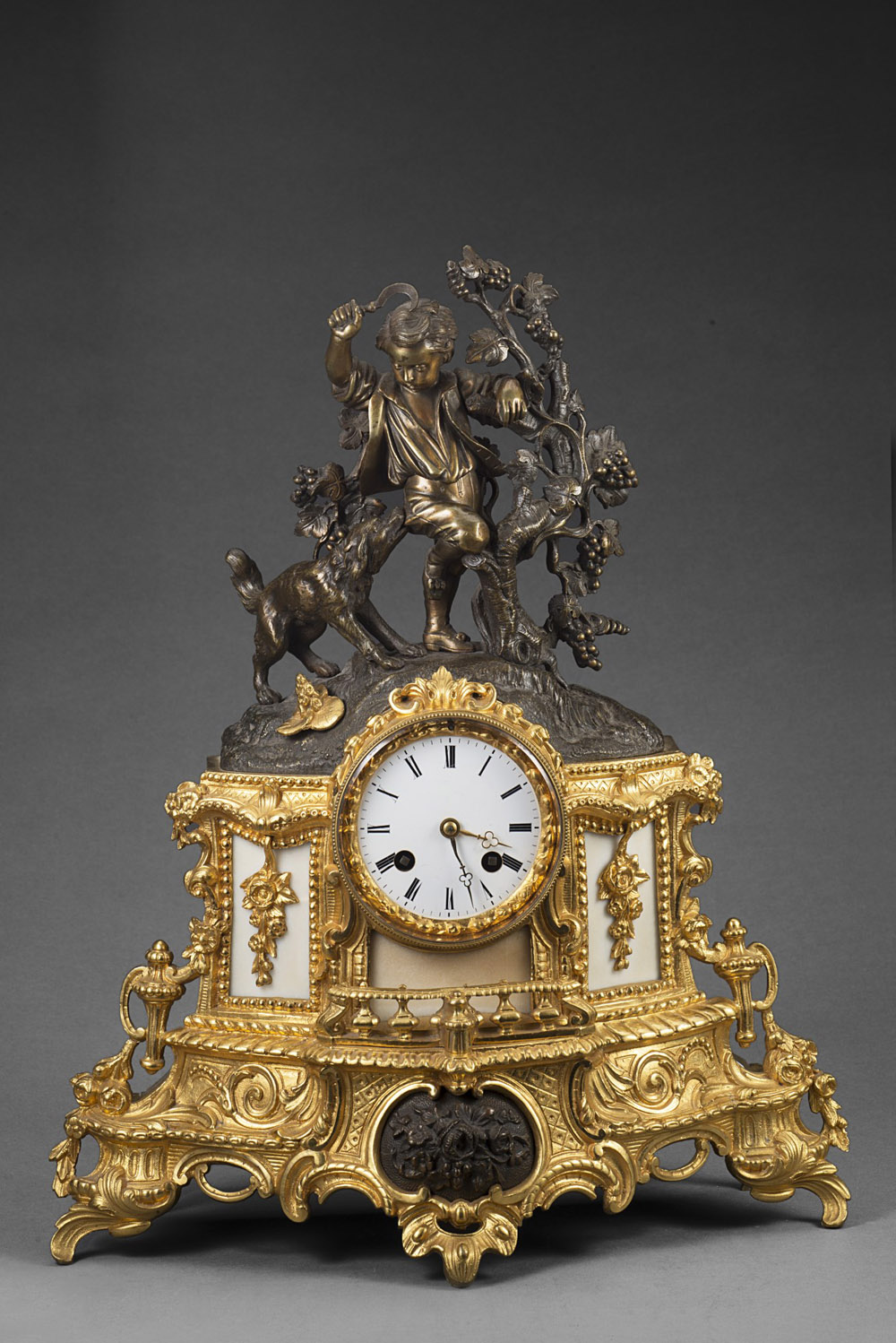 Orologio da camino in ottone dorato con cassa sormontata da scultura di fanciullo e cane. Francia, fine del sec. XIX Movimento con carica a otto giorni, suoneria delle ore e delle mezze su campanello, scappamento ad ancora, sospensione a filo. Quadrante in smalto bianco con cifre romane (h cm 42) (difetti) Late 19th-century French gilt-brass chimney clock (defects)