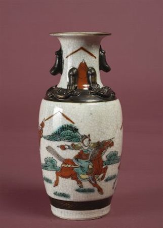 Vaso in porcellana, con decori in rilievo a finto bronzo e guerrieri sul fusto, marcato alla base, Cina, XIX sec