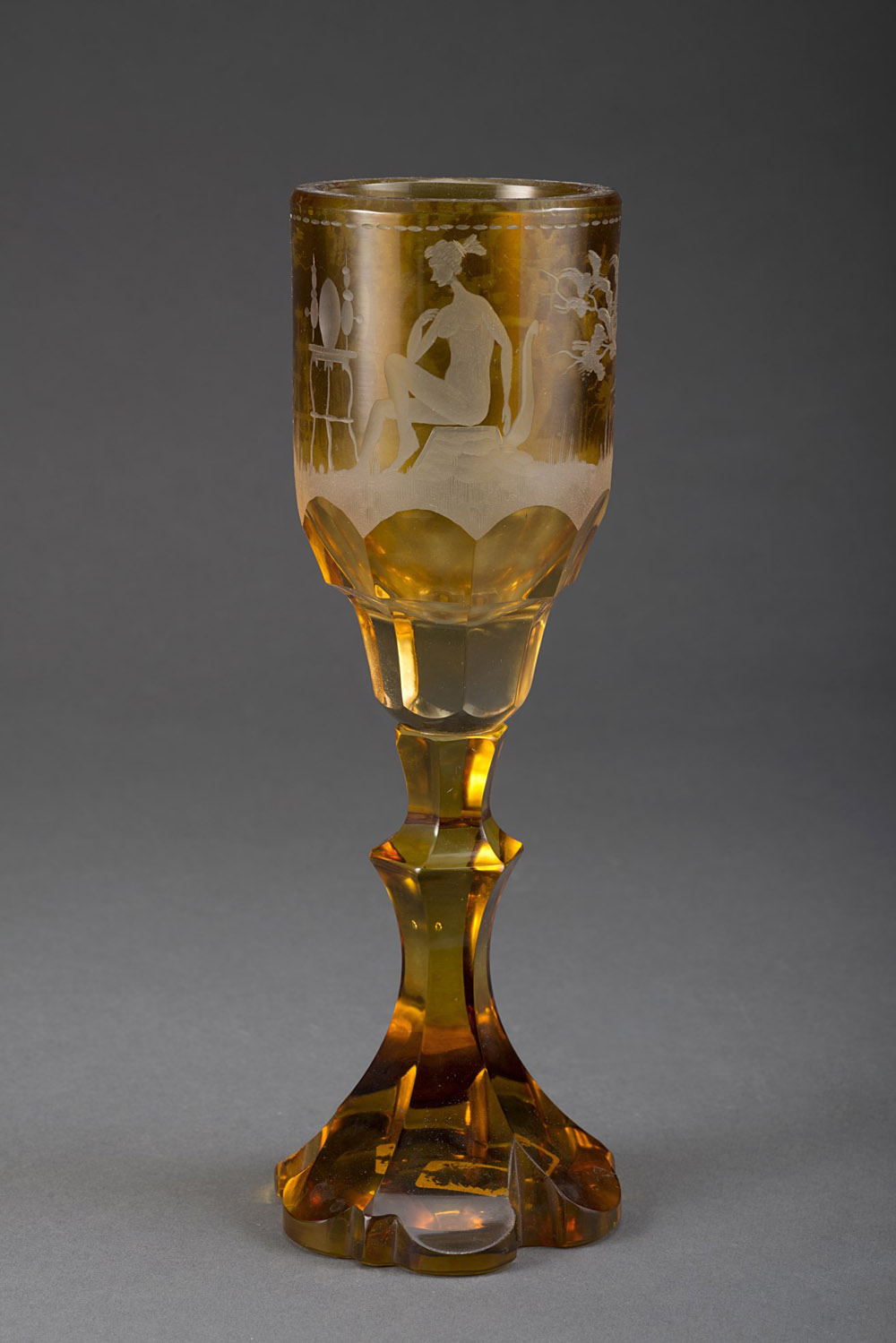 Manifattura di Boemia, inizio XX. Bicchiere in cristallo ambrato e molato con scena di Venere alla toilette in un paesaggio (h. cm 22,5) Early 20th-century Bohemian crystal glass