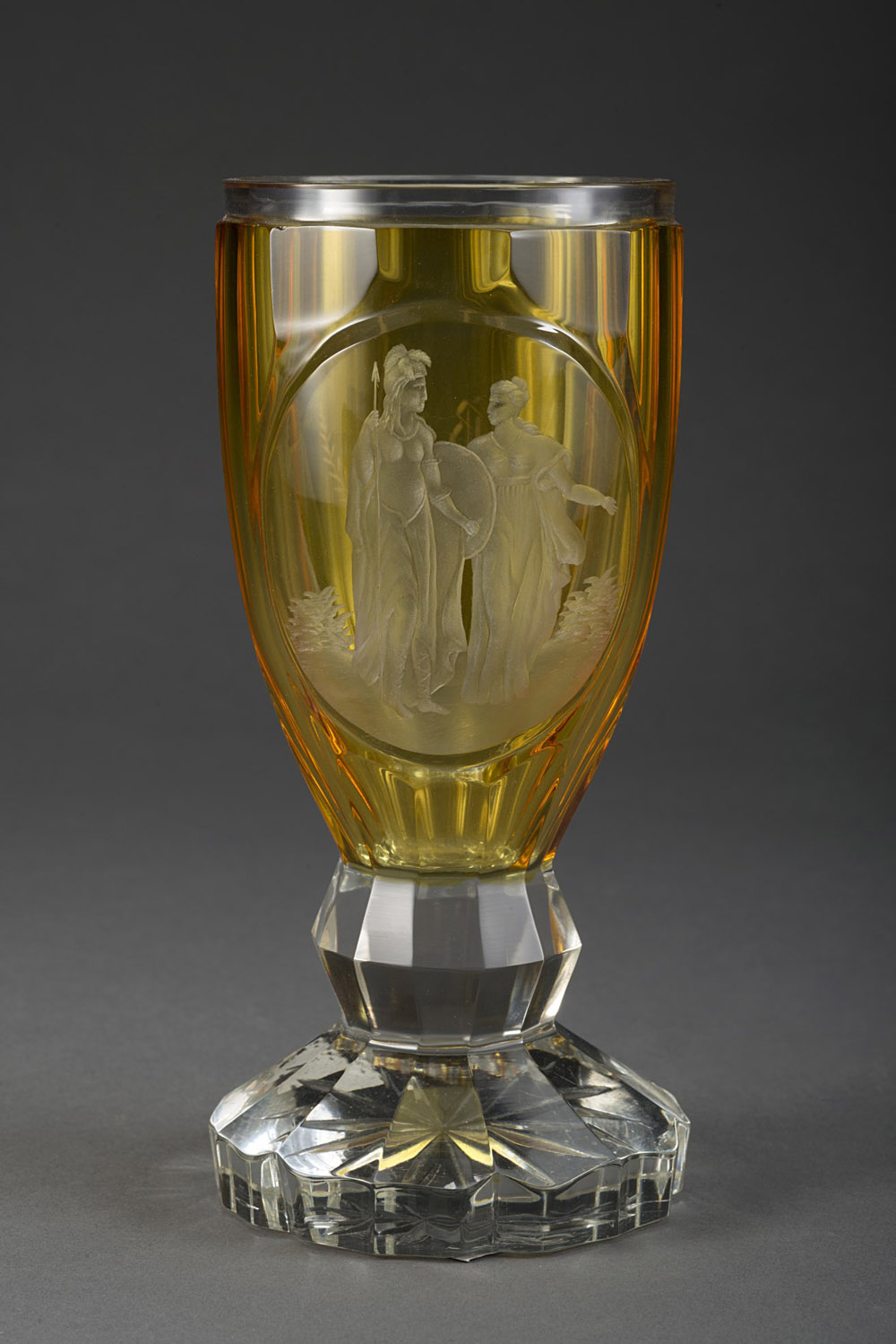 Manifattura di Boemia, inizio sec. XX. Calice in vetro ambrato decorato con scena mitologica entro medaglione e cifrato "RA" tra foglie d'alloro (h. cm 18) Early 20th-century Bohemian glass goblet