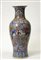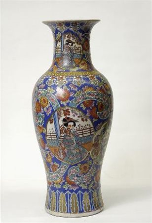 Vaso in porcellana policroma, fondo blu con decori floreali e geishe entro...