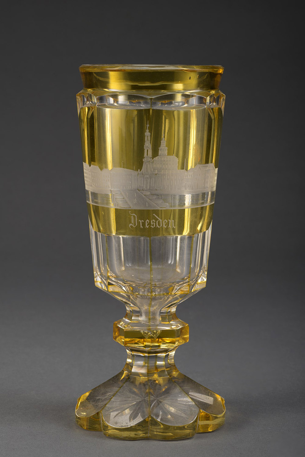 Manifattura di Boemia, inizio sec. XX Calice in cristallo a fondo giallo decorato all'acido con scorcio della città di Dresda (h. cm 19) Early 20th-century Bohemian crystal goblet