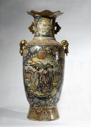 Vaso in porcellana Satsuma, decorazioni floreali e figure entro riserve, con due prese laterali a teste di leone, Giappone, XIX-XX sec. cm. h. 93.