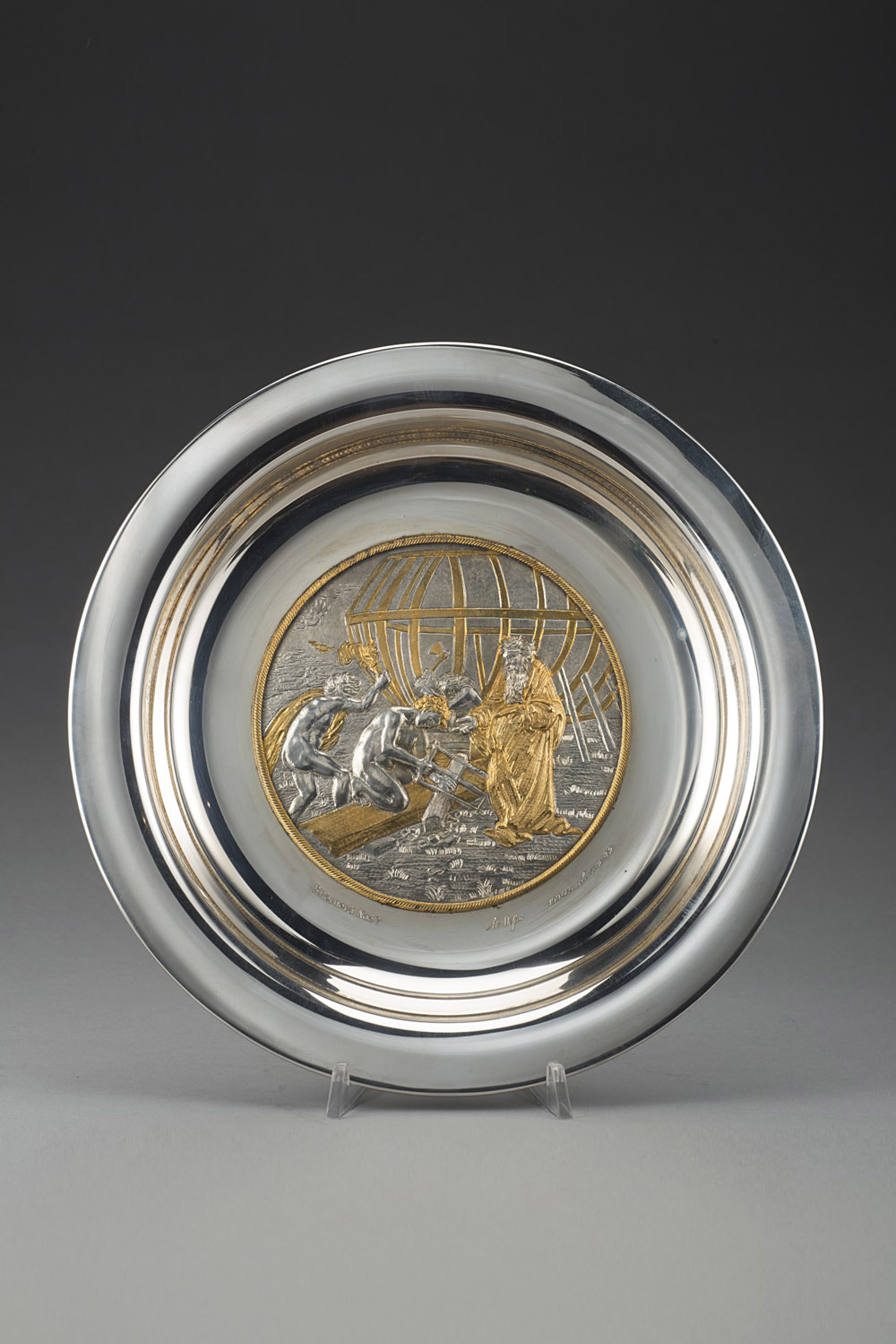 Piatto artistico in argento parzialmente dorato con bassorilievo raffigurante scena intitolata "Ritornerà Noè?". Firmato e marcato Ale Stefani. Esemplare n. 32/199 (gr 480 ca) (d. cm 26) Silver plate
