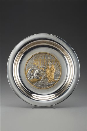 Piatto artistico in argento parzialmente dorato con bassorilievo raffigurante...