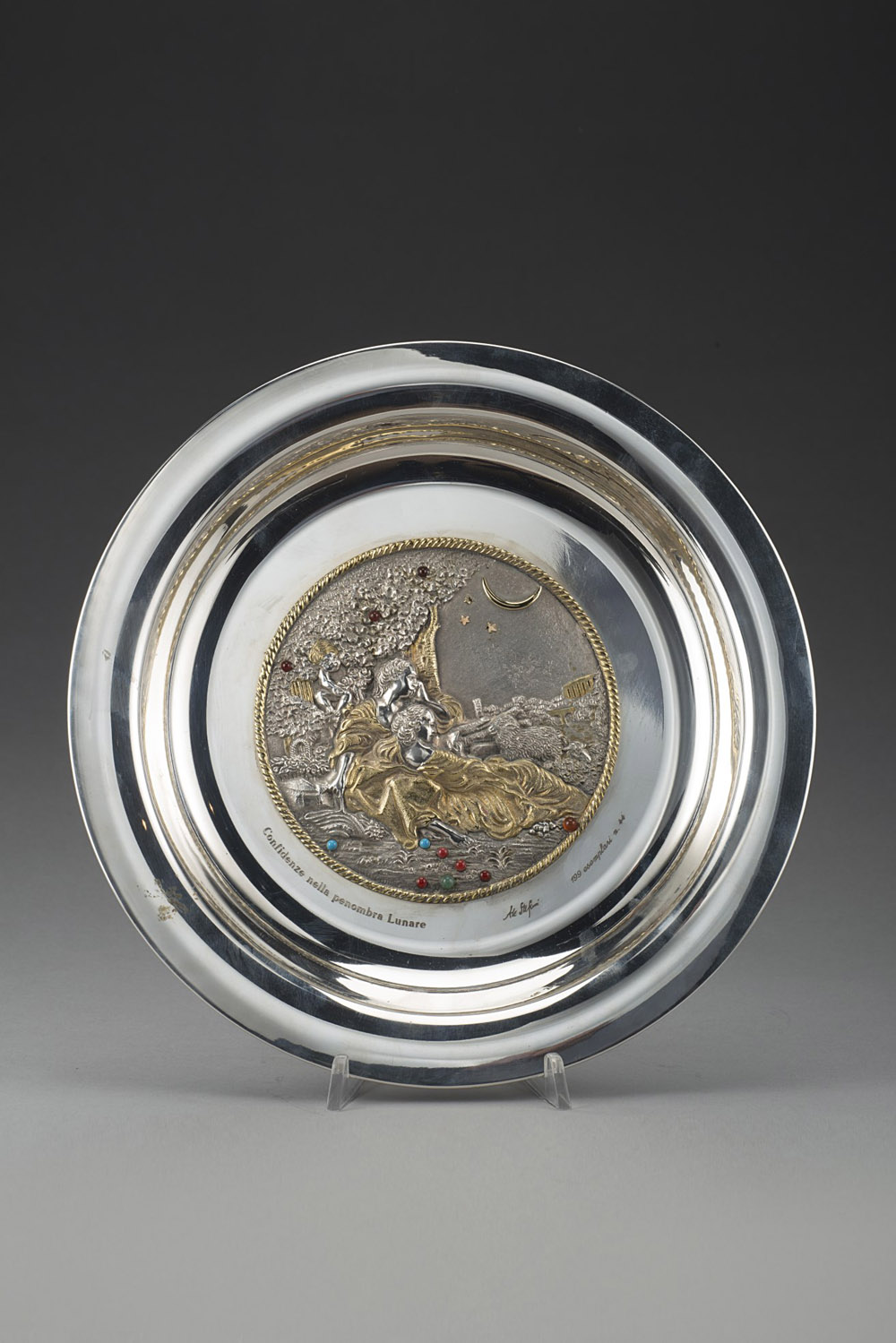 Piatto artistico in argento parzialmente dorato con pietre dure e smalti con bassorilievo raffiguranti scena intitolata "Confidenze nella penombra lunare". Firmato e marcato Ale Stefani. Esemplare n. 44/199. Serie Luna d'oro (gr 480 ca) (d. cm 26) Silver plate