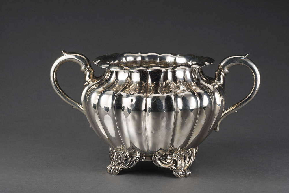 Zuccheriera in argento con corpo globulare baccellato e costolato sorretto da quattro piedi fogliati, due manici ad ansa. Londra, 1854. Accompagnato da certificato di autenticità Boggiali (cm 22x15x12,5) (gr 400 ca) Silver sugar bowl. London, 1854