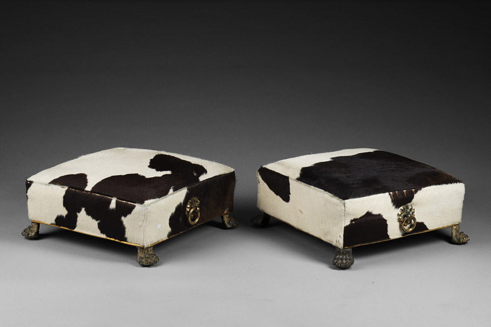 Coppia di poggiapiedi con piedini e prese in bronzo dorato e cesellato rivestiti con tessuto pezzato. Sec. XIX (difetti) Pair of 19th-century footrests (defects)