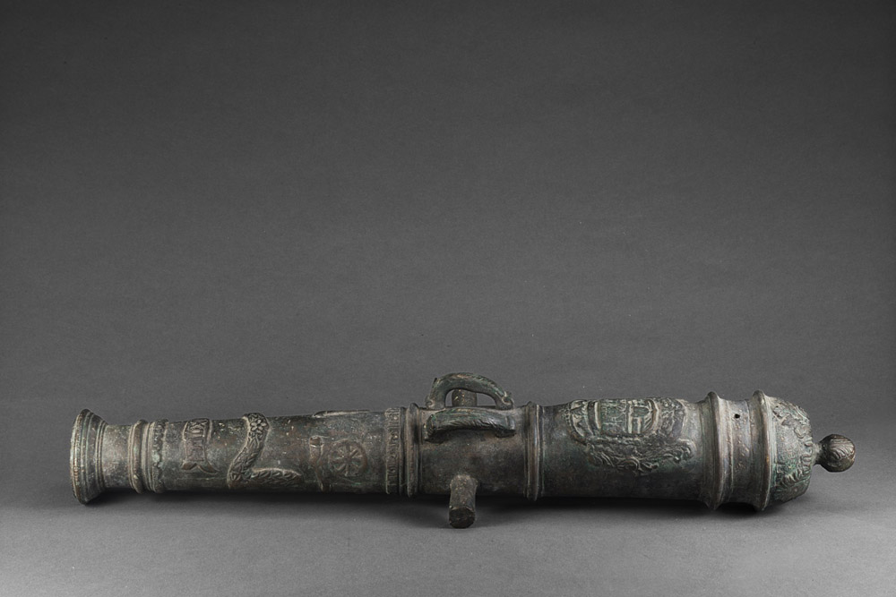 Lotto 386 | Antico cannoncino in bronzo, rilievo a stemma nobiliare, volute ed armi....