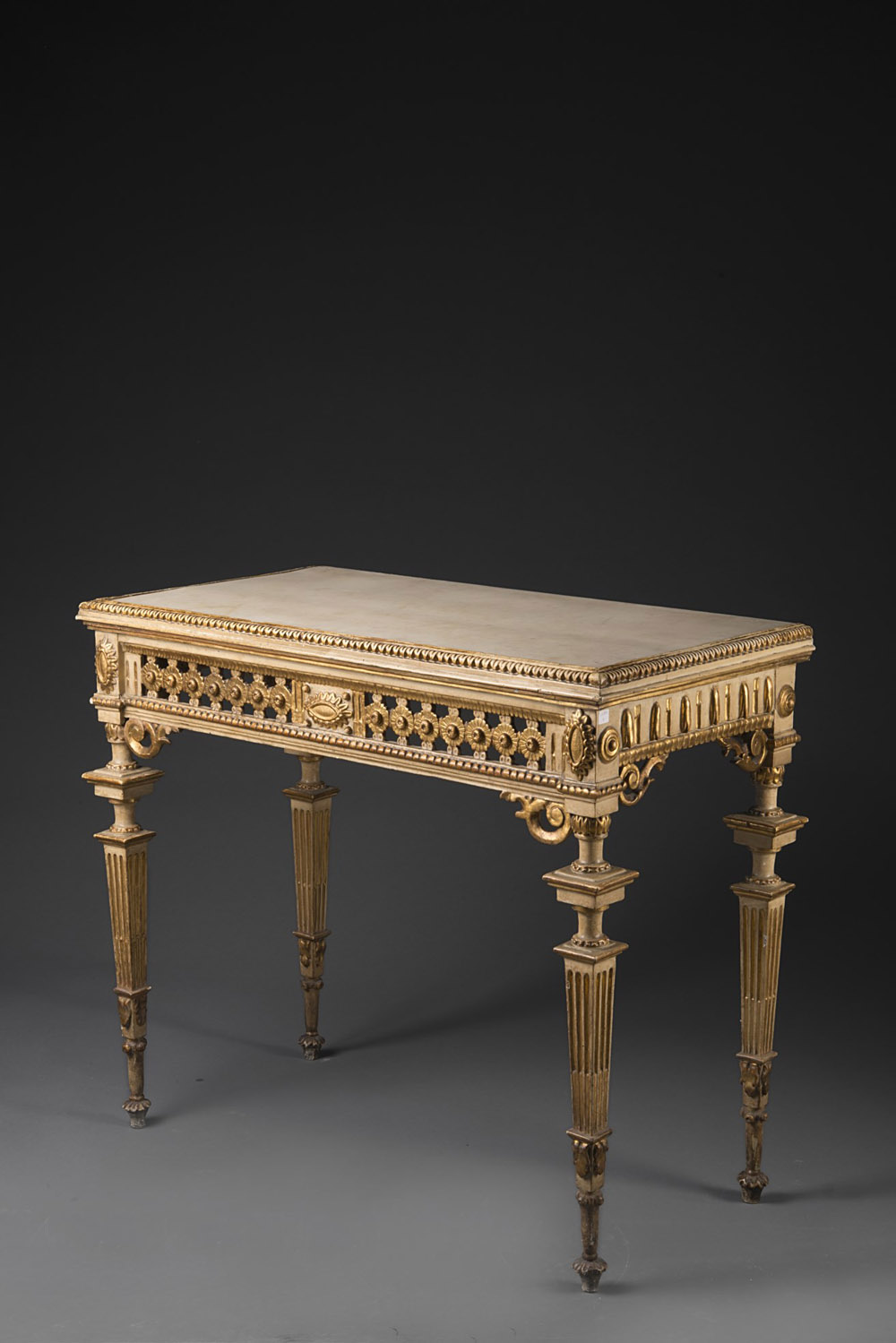 Consolle in legno intagliato, dorato e laccato bianco con fascia traforata e decorata a motivi vegetali. Gambe a colonna squadrata e scanalata, piedi torniti. Piano in marmo bianco. Fine del sec. XVIII (cm 105x91x54) (restauri) Late 18th-century carved wood console with white marble top (restorations)