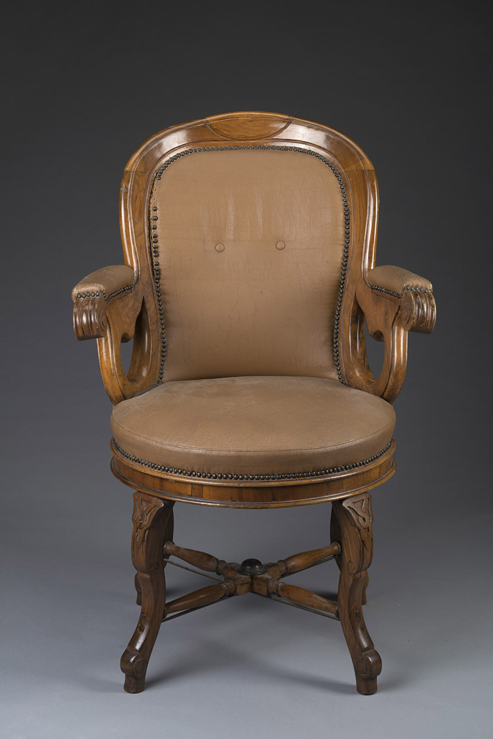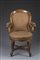 Poltrona da barbiere in noce con schienale e braccioli sagomati, intagliati a ricciolo. Gambe intagliate all’attacco a volute unite da elementi torniti. Sec. XVIII 18th-century barber’s chair