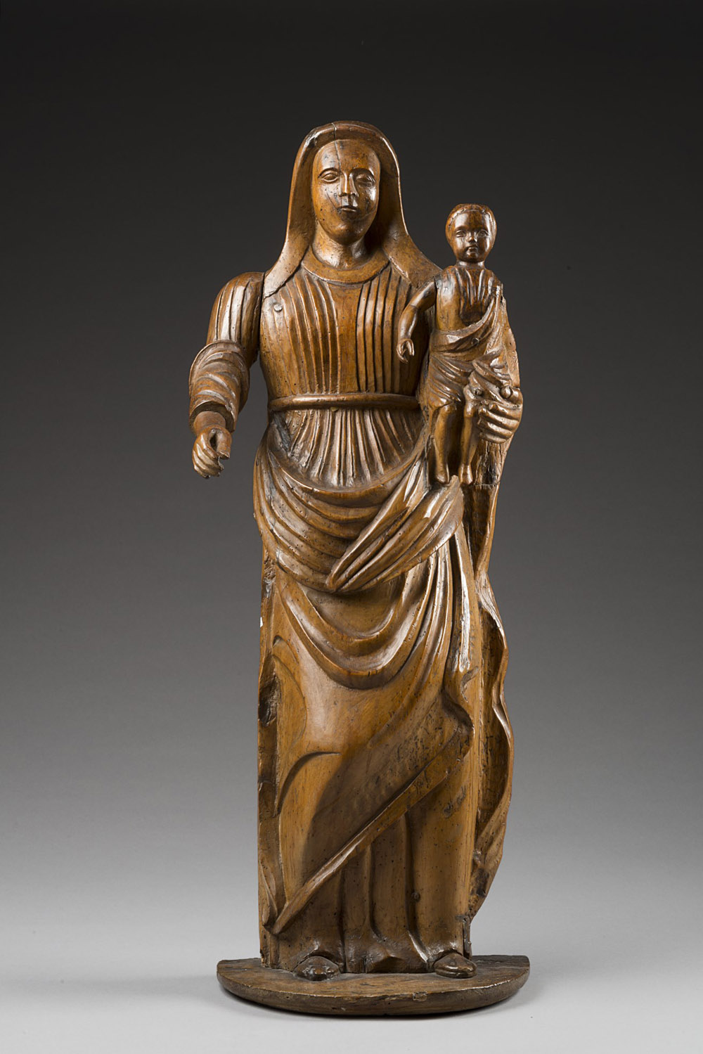 Lotto 411 | Antica scultura lignea raffigurante Madonna con Bambino (h. cm 93) (difetti e...