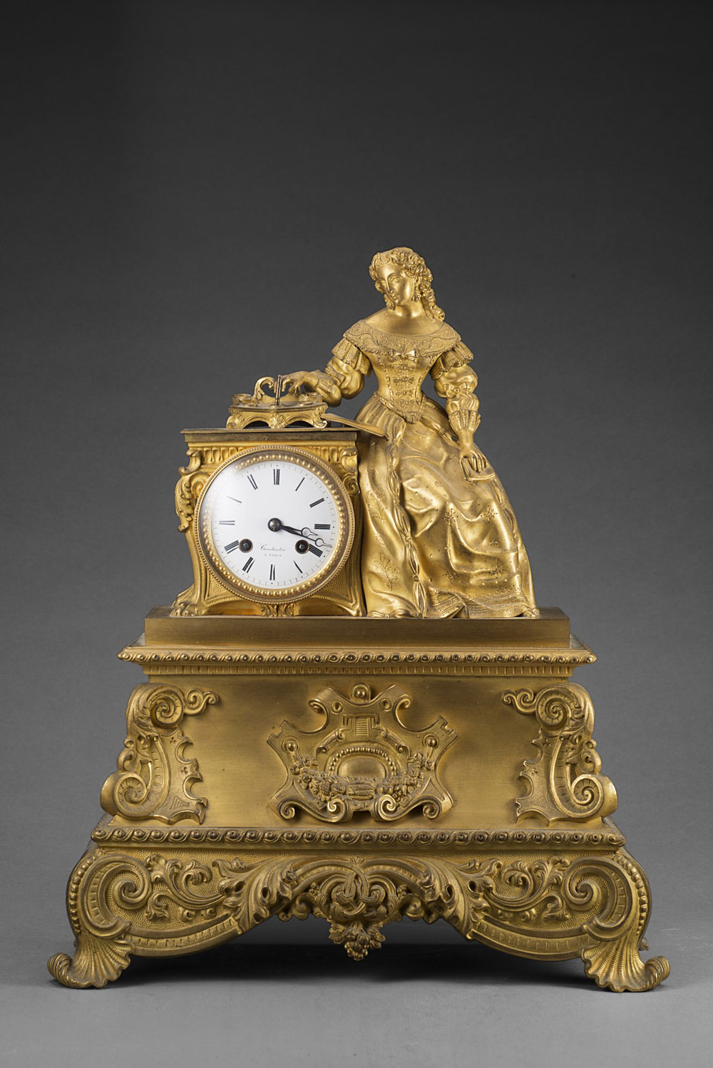 Orologio da camino in bronzo dorato con cassa decorata con figura di...