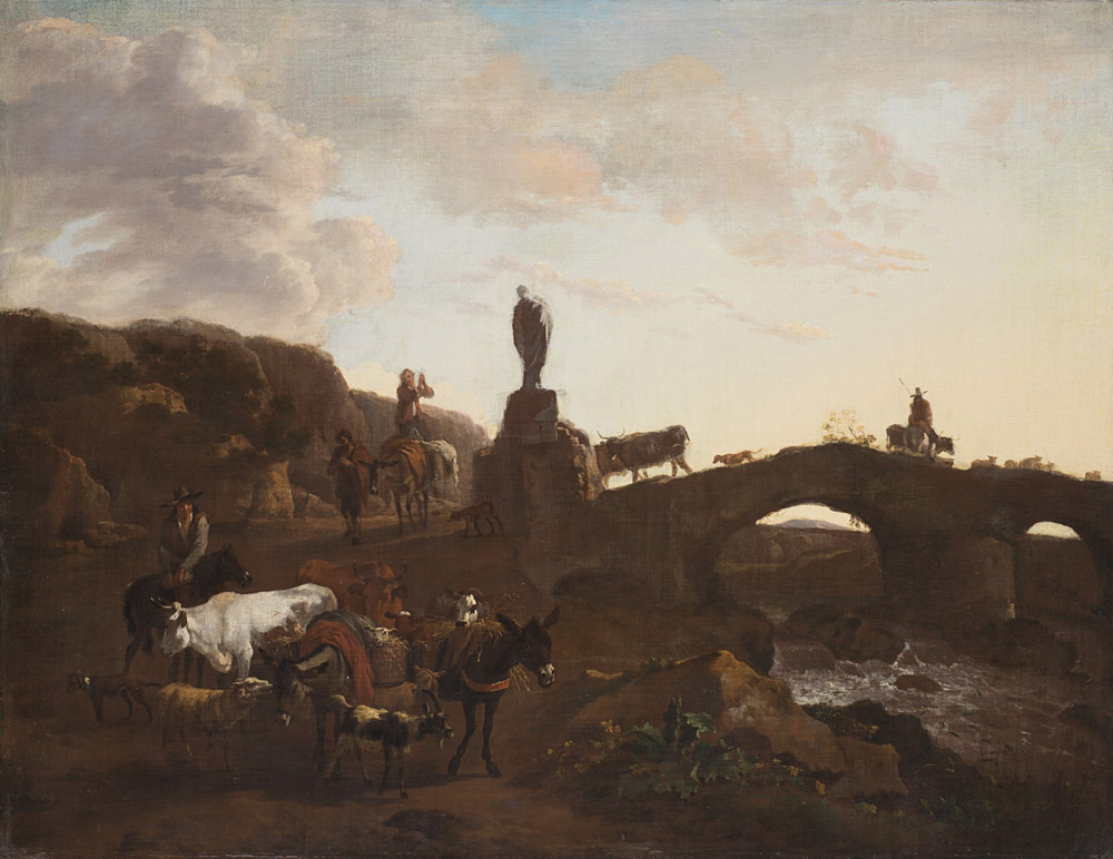 Maestro fiammingo operante a Roma del secolo XVIII "Paesaggio fluviale con ponte, pastore e armenti" olio su tela (cm 71x93) (lievi difetti) In cornice antica 18th-century Flemish master working in Rome 2River landscape with bridge, shepherd, and herd" oil on canvas. Framed (minor defects)