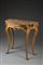 Tavolo da parete in legno intagliato e sagomato con piano in alabastro fiorito e fascia centrata da elemento decorativo. Gambe mosse sormontate da girali di foglie, piedi a ricciolo. Francia, sec. XVIII (cm 85x88x43 (difetti) Carved wood side table with alabaster top. France, 18th century (defects)