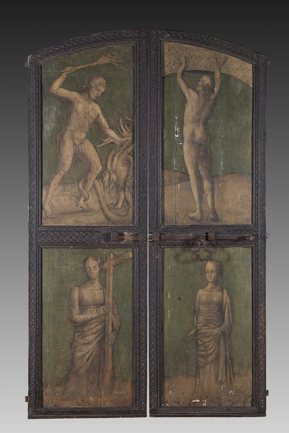 Portoncino a due battenti in legno intagliato a motivo geometrico ripetuto con fiori e rosoni. Pannelli dipinti in policromia con figure mitologiche (cm 268 x80 cad.) Sec. XVII (difetti) 17th-century wooden double door (defects)