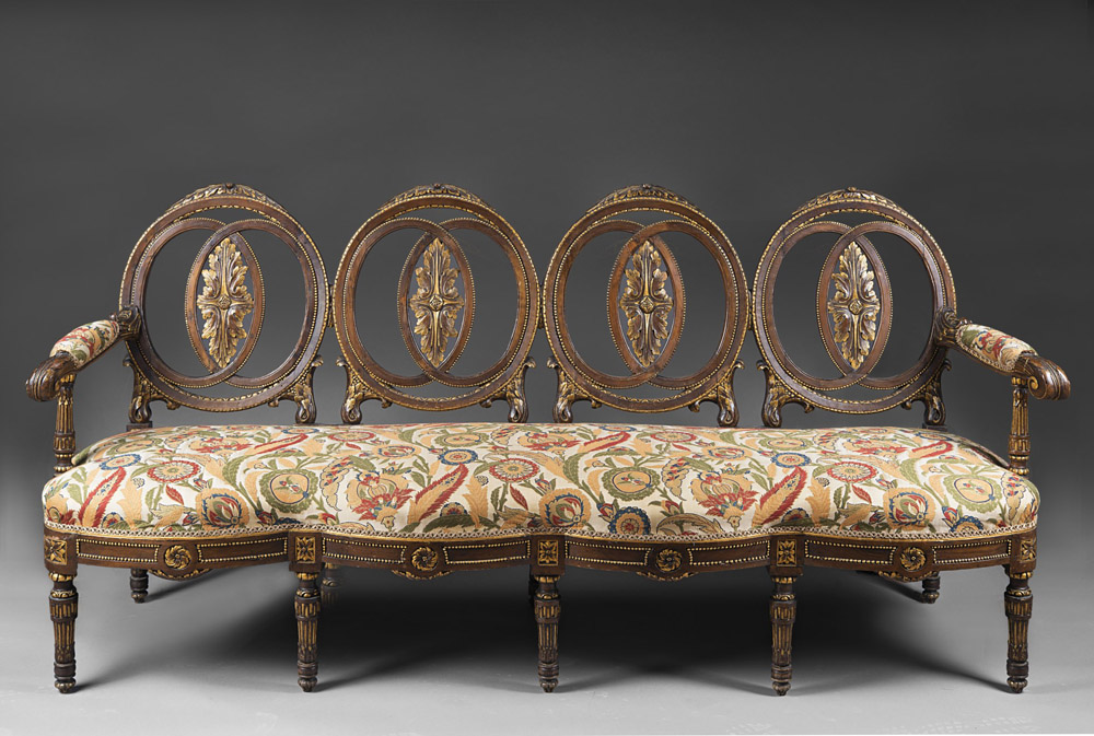Divano a quattro posti con schienale a giorno in legno intagliato a motivi vegetali e parzialmente dorato. Montanti e gambe tornite e scanalate decorate all'attacco da rosoni. Fronte mosso. Fine sec. XVIII (lievi difetti e restauri) Late 18th-century carved-wood four-seater sofa (minor defects and restorations)