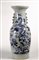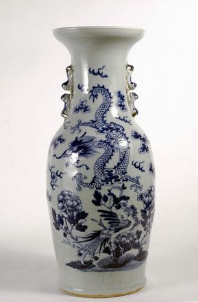 Vaso in porcellana bianca e blu, con decorazioni raffiguranti un drago e una fenice, piccole prese laterali a foggia di cani di Pho, Cina, seconda metà XIX sec., cm. h. 60.