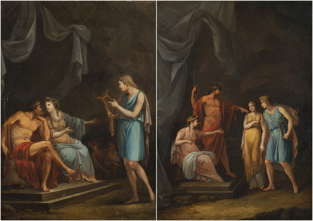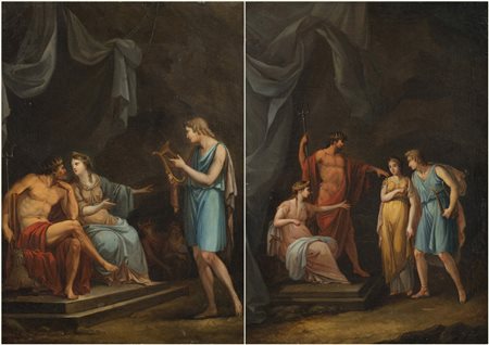 Maestro romano della fine del secolo XVIII "Orfeo ed Euridice davanti a Plutone e Proserpina" e "Orfeo davanti a Plutone e Proserpina" coppia di dipinti ad olio su tela (cm 46,5x34,5) Late 18th-century Roman master "Orpheus and Eurydice facing Pluto and Proserpina" pair of oil paintings on canvas