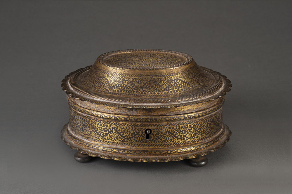 Scatola in metallo ageminato in oro. Coperchio con bordo mosso decorato a volute fogliate e motivi concatenati, piedini torniti. Turchia, inizio sec. XIX (cm 15x8x12) Early 19th-century Turkish gold-inlaid metal box