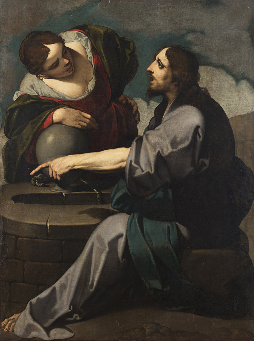 Scuola del sec. XVII "Cristo e la Samaritana al pozzo" olio su tela (cm 146x110)(restauri) 17th-century school "Christ and the Samaritan by the well" oil on canvas (restorations)