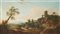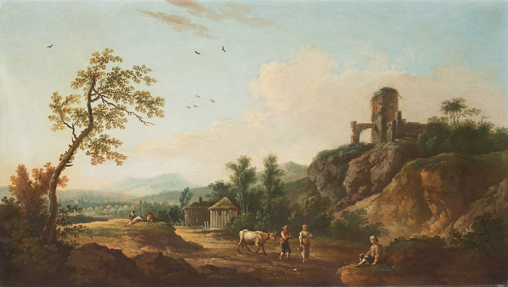 Maestro del secolo XVIII "Paesaggio pastorale con rovine e città sullo...