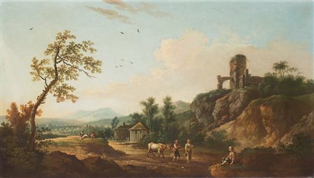 Maestro del secolo XVIII "Paesaggio pastorale con rovine e città sullo sfondo" (cm 58x99)(difetti) In Cornice. Etichetta al retro 18th-century master "Country landscape with ruins and background city". Framed (defects)
