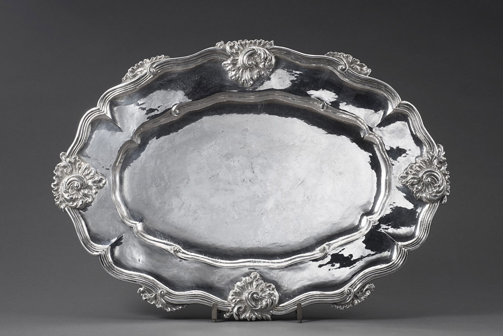 Vassoio ovale in argento con bordo mistilineo gradinato e fregi sbalzati. Tesa e cavetto a nervature (gr 1090 ca) (cm 49,5x35) (lievi difetti) Oval silver tray (minor defects)
