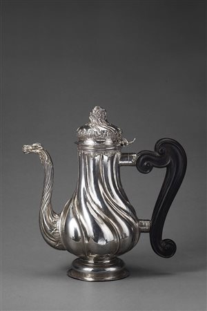 Caffettiera in argento nello stile del barocchetto genovese. Piede circolare, corpo piriforme con beccuccio zoomorfo e coperchio costolato con baccellature tortili. Manico ad arpa in legno ebanizzato (gr 1200 ca) (h. cm 29) (lievi difetti) Silver Genoese "arocchetto" style coffee pot (minor defects)