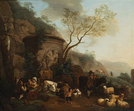 Nicolas Berchem (attr.)(Harlem 1620 - Amsterdam 1683) "Paesaggio con pastori, armenti e vaso classico" olio su tela (cm 46,5x57). In cornice di metallo "Landscape with shepherds, herds and classic vase"