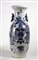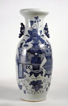 Vaso da pavimento in porcellana bianca e blu, con prese laterali traforate, decorato in stile Pe-Ku, Cina, fine XIX sec., cm. h. 60.