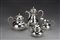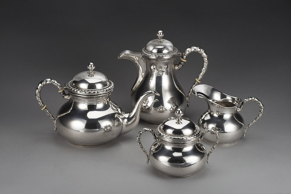 Servizio da tè e caffè in argento a corpo liscio decorato con prese e profili...
