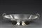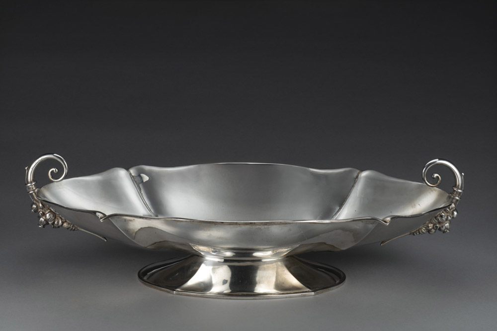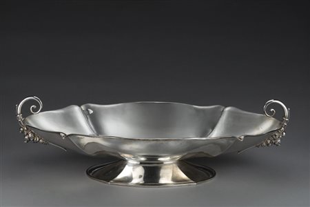 Alzata in argento a due manici con corpo costolato e bordo mistilineo. Argentiere Miracoli, Milano, anni '20 (gr 2280 ca) (cm 54x34x15) (lievi difetti) Silver fruit stand. Milan, 1920s (minor defects)