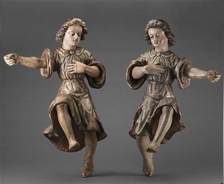 Scultore della fine del sec. XVII Coppia di angeli in legno laccato e dorato (h. cm 62) (doratura e lacca di epoca posteriore) Late 17th-century sculpture. Pair of lacquered gilt-wood angels (gilt and lacquer of a later period)
